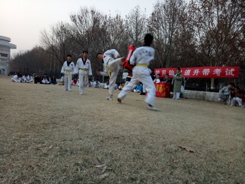 2016年12月10号下午3点,跆风跆拳道社团在学校第二体育场进行了一学期一度的升带考试。会长,教练都到场进行了指导。