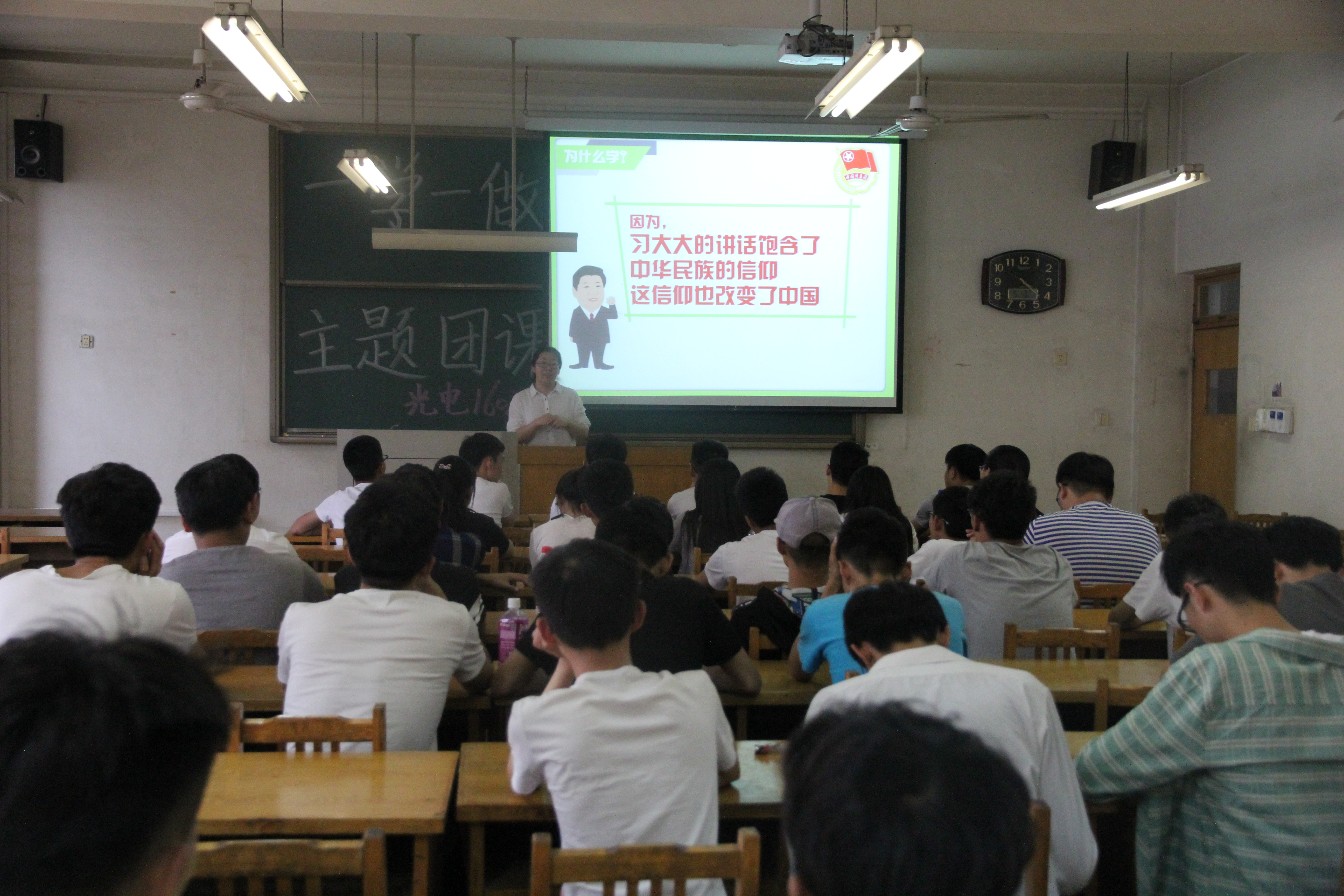为深化“一学一做”学习教育,积极响应习总书记的号召。我校理学院光电1602班于5月3日下午在15号教学楼338教室召开“学习总书记讲话,做合格共青团员——教育实践主题团课”。