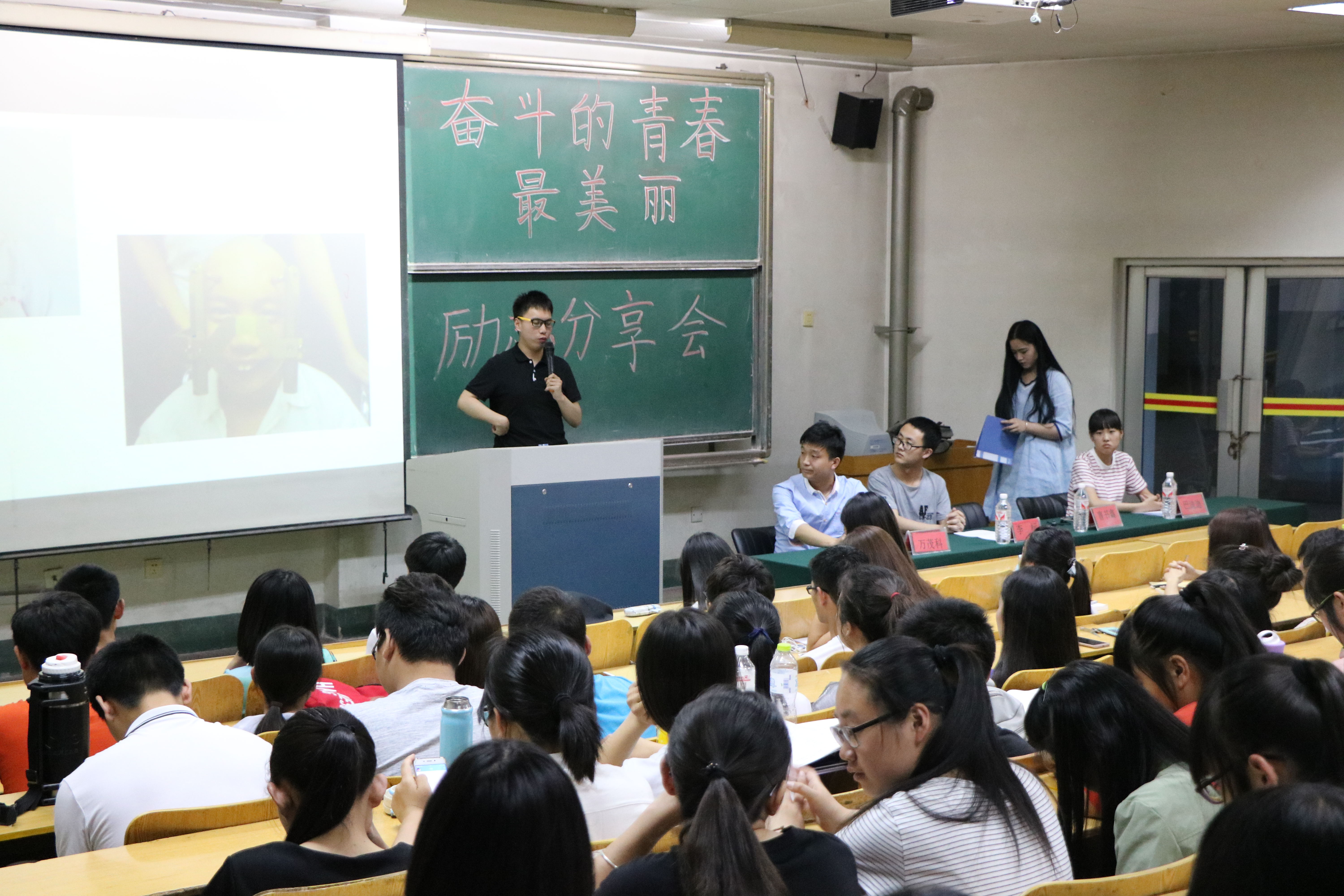会议伊始,主持人张璇清涵宣布此次分享会开始,各位宣讲人依次上台进行宣讲,首先,曹书鑫同学讲述个人经历,命运的捉弄,一场手术使他从此无法用右手写字,自强的他渐渐学会了用左手写字,并勇于战胜自己在学业上的困难。大学里,作为唯一一个走读生,他坚持遵守学校的规章制度,每天按时到校,学习之余,还会通过读书充实自己,最终努力成就出最完美的自己。“我们走的每一步,都有他存在的理由”一句话的结束,使在座所有人掌声不断。随后,李标向我们介绍ACM集训队“以梦为码”为主题,结合自身经历讲述ACM集训代表队的主要活动及其内容,并重要说明在各种学习及比赛中我们要坚持克服种种困难,努力奋斗前行,青春岁月里,唯有奋斗能够充实自己。“奋斗不惜,青春不悔”一直是他坚信的道路,他告诉我们:坚持,奋斗,充实人生,走一段人生最美好的路。紧接着,巴迪迪结合PPT向同学们展示向日葵志愿服务团在行使志愿的道路上所遇到的种种困难,实践条件的艰苦并没有使他们放弃对别人的帮助,而是依然选择一路向前。同时结合自身遇到的经历,讲述一个小孩因为疾病需要救助的事情,通过他们积极的联系义诊,男孩的生命得以救治。人生中遇到的困难很多,但我们要坚信,通过自己的努力定会创造不一样的精彩人生。最后,万茂科学长就自己考研经历作了一番论述,大学四年的实践经历,磨炼了他坚强的意志,成为了如今优秀的自己。他说:“他是幸运的。幸运的过了大学四年,得到了比较优异的成绩。”最终,他告诫在场所有人,要谦虚待人,勇于挑战,坚持不懈,成就属于自己的人生。掌声响起,此次分享会圆满落幕,而我们的人生才刚刚开始。