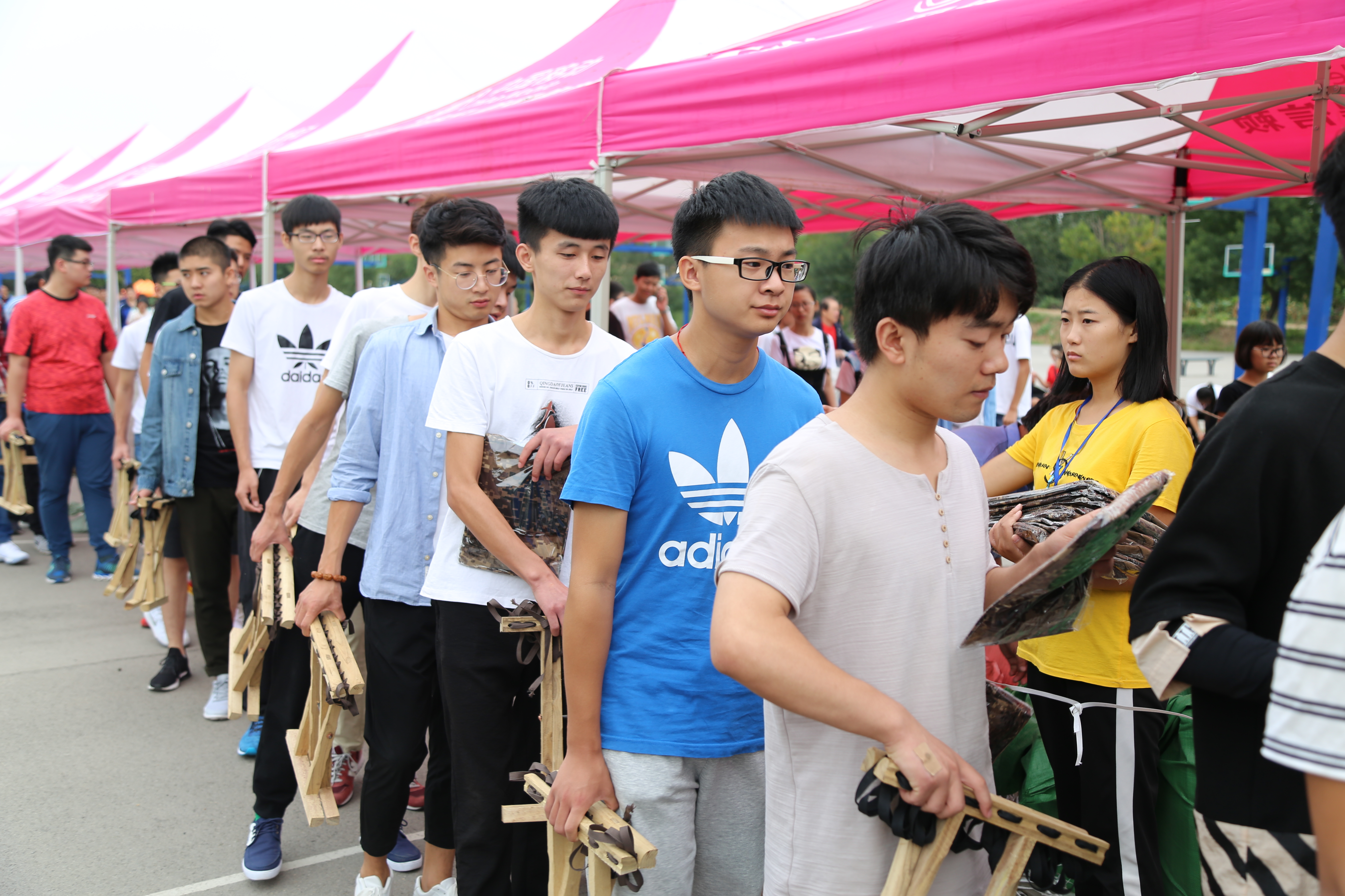 学生会相关成员与教师共同协调此次军训服装分发活动,大家分工合作,部分成员负责不同型号的军训服,另一部分负责帽子和军训鞋的发放。大一辅导员张丽姣与带班学长读取每个新生在网上预留的尺码,以班级为单位,按学号排好队伍后集体来到三体,依次领取自己的鞋帽服装。整个工作进行的十分顺利,从8点45至9点,仅仅15分钟时间,每个新生都拿到了自己的军训服装。