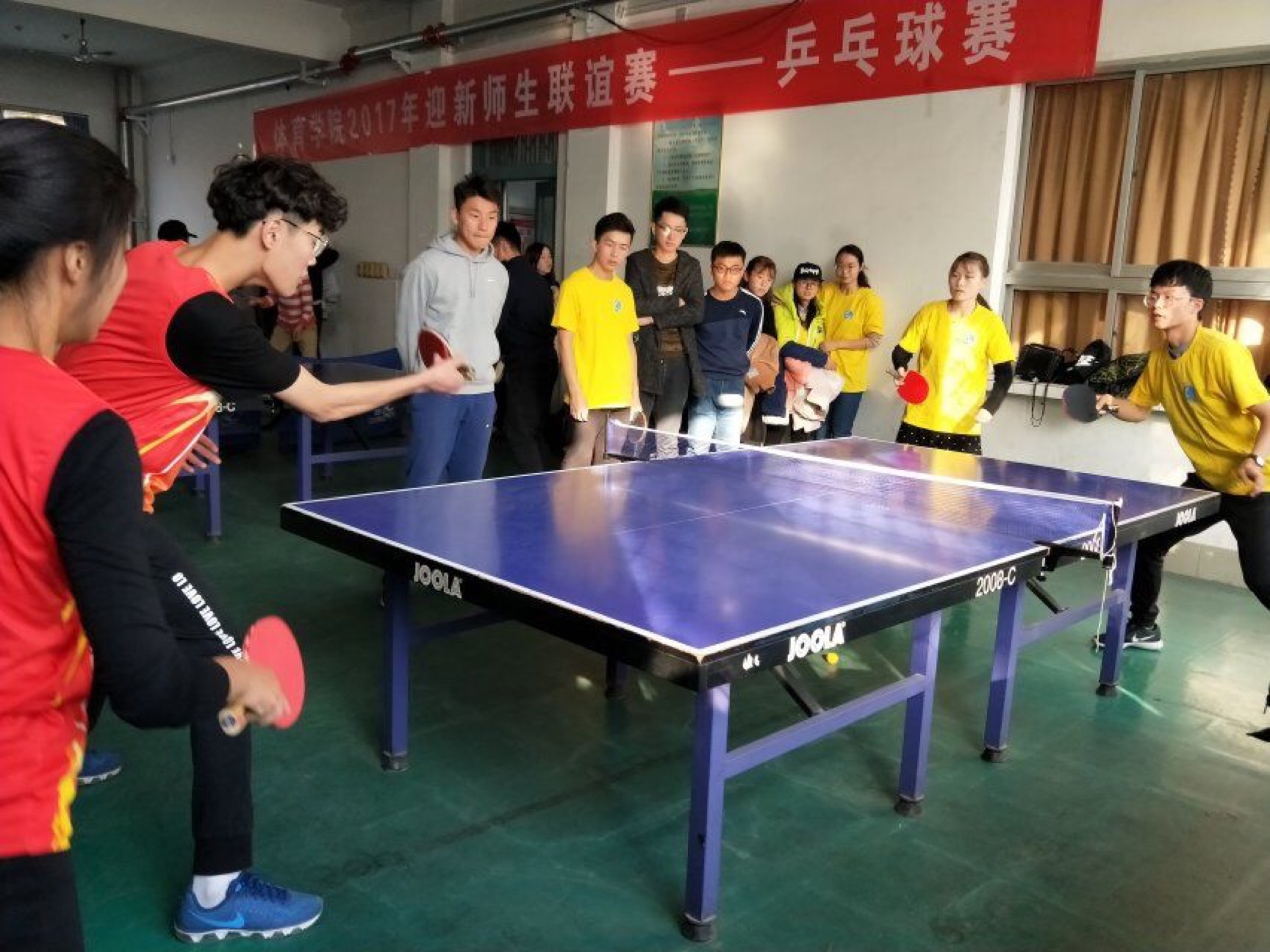 本次比赛共分为男子单打、女子单打和男女混合双打2个项目,共有120人参赛,比赛坚持“友谊第一,比赛第二”的原则。为了保证比赛公平公正的进行,前裁判员进行了宣誓。随着负责人对比赛规则的宣布,比赛正式拉开序幕。小组赛采用了个人赛五局三胜制。“选手们的精彩表现使得乒乓球以优美的弧线越过空中,博得了一阵阵的喝彩。赛事现场进行的热闹有序。一派朝气蓬勃的景象。