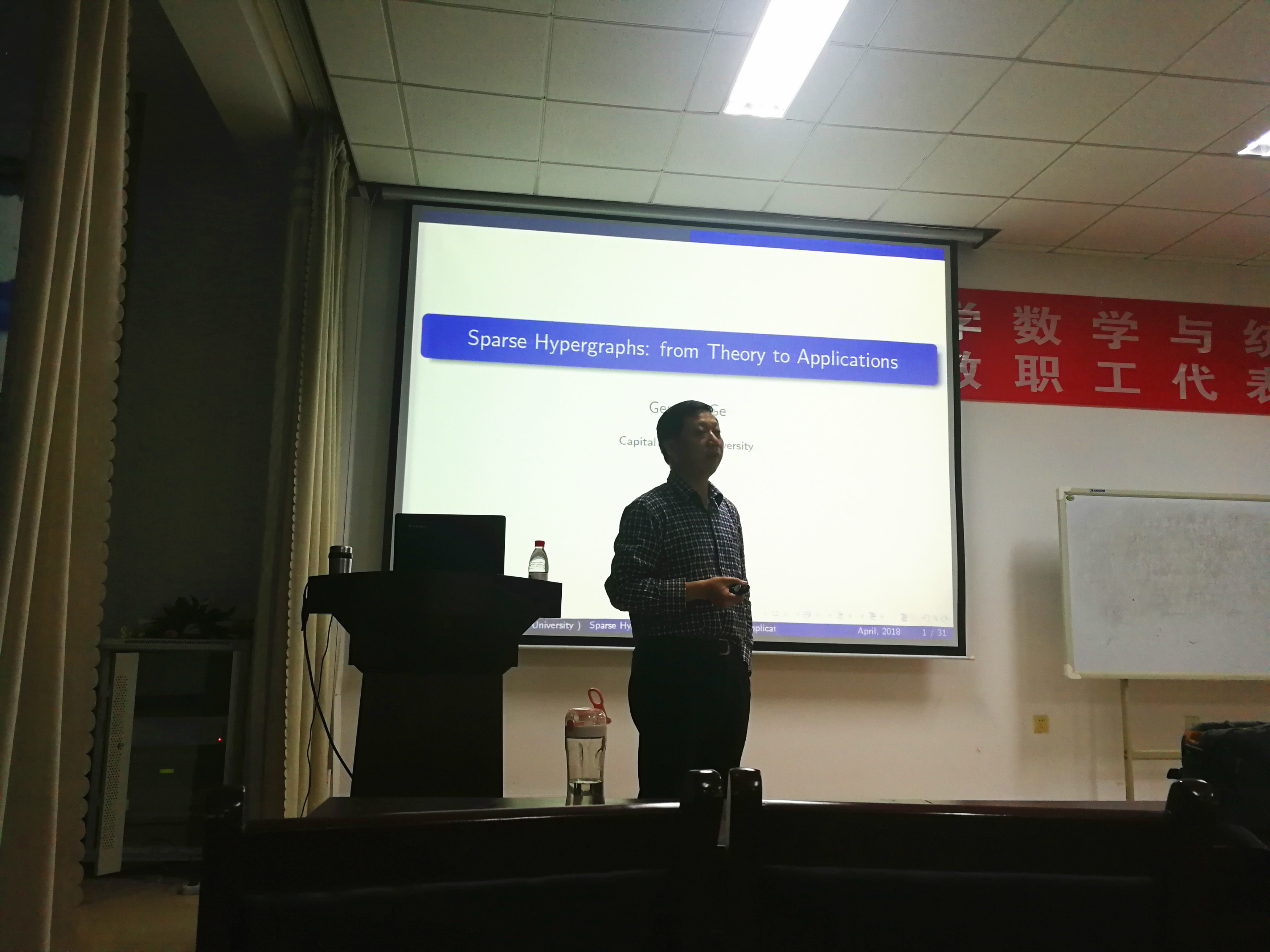 2018年4月19日,教育部长江特聘教授、国家杰青、国家百千万人才、北京学者、首都师范大学特聘教授、博士生导师葛根年教授受邀来我院430报告厅作学术报告,学院院长 李功胜教授、学院教授委员会成员 王建锋教授、 曹永林教授等部分学院教师和硕士研究生及计算机学院崔鑫老师参加了本次报告会。首先李院长代表学院对葛教授的到访表示欢迎,并对葛教授做了简短的介绍。此场报告以稀疏超图为主题,介绍了稀疏超图的基本概念和相关问题,以及其在信息科学中的应用。葛教授林教授以其渊博的知识,又富有创造性的思维带领在座师生漫游在数学和信息科学的海洋中。