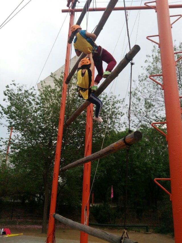 这项活动是由两位队员通力合作爬上高约八米的天梯,不仅是对勇气和意志力的考验,更需要二人齐心协力共同面对绳索摆动、体力透支的考验。令人感动的是队友的鼓励使同学们征服了一次次失败,到达终点。当登上最后一阶时,自信的笑容在说:即使将来我们跌落尘土,暮色沉沉,双眸宁焉,但内心会让我们坚持再坚持,胜利的光芒定会光顾。这是一份拯救,它想告诉我们千万不要随随便便选择平庸。华山再高,顶有过路。