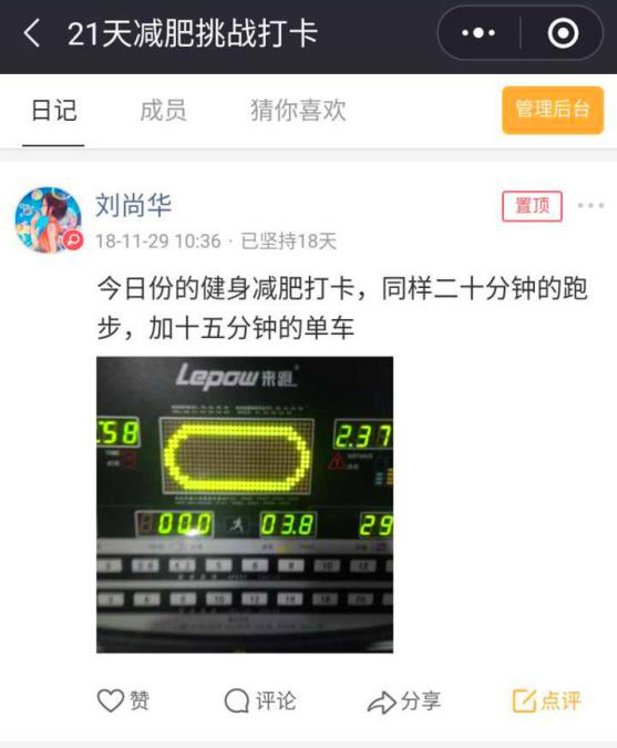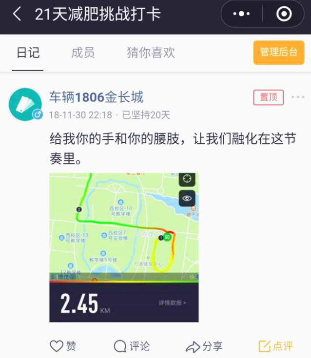活动开始前一天,社团以发放宣传单的形式在各个餐厅门口进行宣传,并将同学们召集在一个教室里进行活动规则讲解。活动伊始,参加者要进行体重称量,并由相关人员记录起始体重,活动中,大家通过每天打卡截图的形式监督自己,参加者可以通过跑步,做操,少吃高热量的食物,合理饮食等健康的方式来减肥,活动不允许通过节食等不合理的方式减肥,另外,参加者可以在相关群里探讨减肥方式。活动结束,会进行二次称重并根据两次体重差值进行评奖,这也大大促进了同学们的积极性,增加了活动的趣味性。