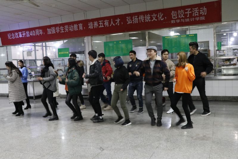 活动进行到尾声,大家吃着自己包的饺子开始看精彩绝伦的演出。首先数教1803的《歌舞青春》活跃了全场的氛围,接下来阿依迪亚尔、娜菲莎、叶力盘、鲁提普拉吉他弹唱《你不知道的贝加尔湖畔》。欣赏完了优美的吉他弹唱紧接着感受新疆的民族风情,阿依迪亚尔和叶勒亚森的《民族舞串烧》带领大家领略了新疆的独特风情。其后,禹世泽和徐玥一起用吉他将大家的思绪飘向了远方,改编后的《东西》多了一丝趣味。由数教1702班带来校歌《你伴随我》,将此次活动推向高潮。