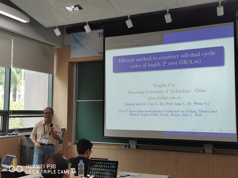 第六届中韩编码理论及相关领域国际学术会议于2019年7月1日至5日在韩国首尔市的韩国高等科学技术院(KIAS)召开。本次会议共有四十多位专家和学者出席会议,其中有来自中国南开大学、西安电子科技大学、香港科技大学、南方科技大学、南京航天航空大学、华中师范大学和安徽大学等十多所大学的十九位学者出席,韩国、德国、南洋理工大学、日本的二十多位教授、博士和硕士生。会议安排二十九个学术报告,报告内容涉及到分组纠错编码、量子纠错码、后量子密码、序列集的数学理论等当前通信领域的重要问题和有限域上曲面理论、置换多项式理论、正则图理论等组合数学问题。与会代表们报告了在各自研究领域内取得的新成果,并就编码及相关领域的问题进行了深入、广泛的交流。曹永林教授应邀出席本次会议,于7月2日上午在会上作题为 “构造Galois环GR(4, m)上码长为2^k的自对偶循环码的有效方法”的报告、介绍本校研究团队在代数编码领域取得的新成果。