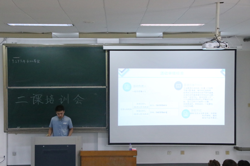 活动开始,程浩文给大家讲解活动的审核标准,他用之前的举办过的活动为例,为大家分析了活动时间、参与人数的明确、以及奖项的设置,活动负责人所需要完成的任务。接着又介绍活动的审核流程,他将流程大致分为两部分,一个是培养方案内的要求填写《活动申请表》录入第二课堂培养方案活动中,另一部分是培养方案外的需要填写《审批备案表》培养方案外的活动要审核备案,之后交给相关负责人,再由二课服务中心的老师负责审核。他将第二课堂的成绩划分成学分、学分替代和管理办法三个方面,以便让二课成员可以更好的了解第二课堂成绩的用途。最后他强调了第二课堂规范性,二课负责人要遵守各项规章制度,严于律已,尽职尽责,不能马虎对待,更不能不负责任,对于员工第二课堂的成绩,要严格把关,做好记录,对于那些只是加学分但不参与的员工进行区分和甄别。