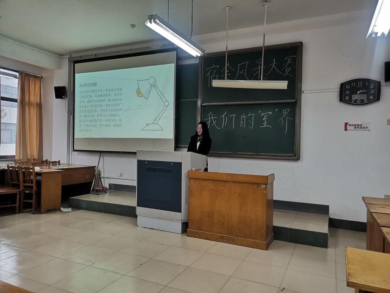 活动伊始,主持人首先介绍了本次活动的比赛规则及评分细则。接着,参赛人员依次上场介绍自己的宿舍,他们首先介绍自己本宿舍制定的宿舍公约,并采用PPT和VCR短视频等多种形式,形象的展示自己宿舍的文化,通过分享宿舍中发生的生活趣事,串联起宿舍成员之间的亲密感情。
