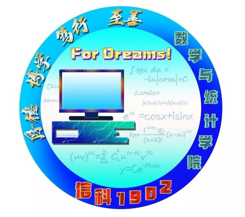 班徽以蓝色为主色调,蓝色属于天空也属于大海,是和谐、是广博。它由数学公式和计算机组成,充分体现我们信科专业的特点。青春求极限,几何解人生。一道道公式、一串串字符,汇聚了我们的青春,谱写了我们为梦想永不停歇的美好篇章。