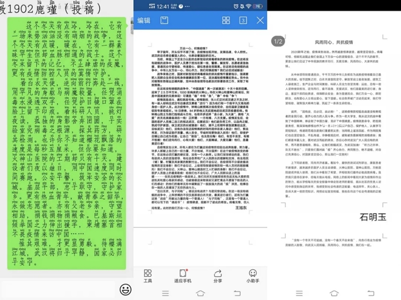 接着,大家都声援武汉,为爱献声。王旭东发动在家里的同学们,利用身边的手机,为奋战在武汉抗疫一线的广大医护人员和在各自岗位上辛苦付出的每一个人,录制短视频进行加油打气。笔尖送温暖。同学们携笔从戎,在抗击疫情的战场上,石明玉写有《风雨同心,共抗疫情》的文章,王旭东写下《万众一心,何惧疫情?》的征文。同学们也为武汉写下了祝福,愿疫情早日解除,患者早日康复。传递抗击疫情正能量,手写祝福送给奋斗在前线的逆行者们,我们无法亲手给予他们帮助,只能给他们送去最真挚的祝福。一言一语,都传递着大家对武汉、对逆行者们、对患者们的最真挚的祝福,最美好的期盼!