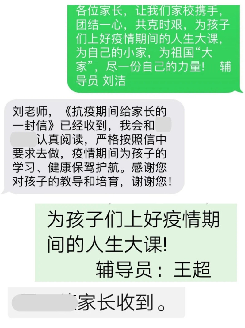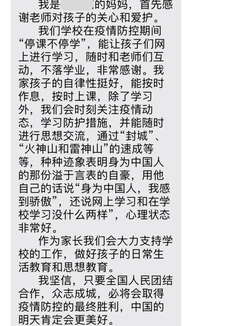 各位家长,让我们家校携手,团结一心,共克时艰,为孩子们上好疫情期间的人生大课,为自己的小家,为祖国“大家”,尽一份自己的力量!