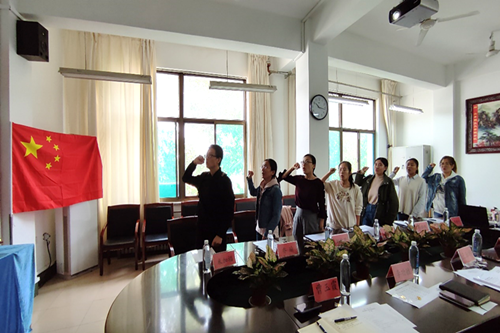 随后,在副经理王贵栋的带领下,新进教师面向国旗进行了入职宣誓。院领导为新进教师佩戴了校徽。