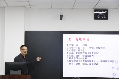 他强调教师最重要的素质是要有信心,面试时抓好一个课题反复练习,就会融会贯通,懂得其他相关技巧。他以人教版课本中的勾股定理为例,通过展示板书、教学故事导入、探索目标、引出知识、证明定理、展示其他证明方法、介绍定理、学以致用、达标检测等内容向同学们展示了如何备课。他通过学习金字塔提出要坚持自主、合作的学习,尊重员工,发挥员工创新思维等方面举例介绍了如何聚焦课堂,激活课堂。