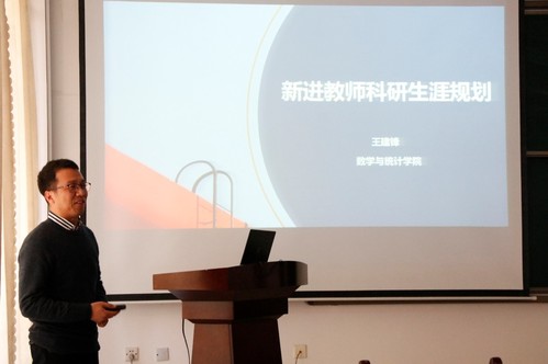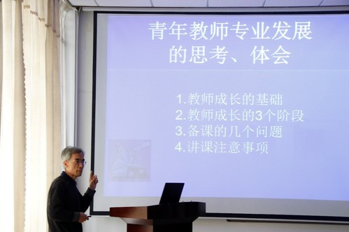 付夕联教授以“青年教师专业发展的思考、体会”为主题,结合自己33年的一线从教经验,从教师成长的基础、教师成长的三个阶段、教师备课的几个问题和教师讲课注意事项四个方面深入浅出地向大家讲述了如何讲课、如何讲好课。他重点向大家讲述了青年教师成长各阶段可能会遇到的问题以及相应的解决方法,并提醒大家要认真备课,除熟记理解知识之外,更要挖掘知识背后隐藏着的思想、方法和精神,并将其运用到教学设计中去,提高教学效果。他鼓励青年教师要在教学中充分体会数学之美,经过努力早日达到投入享受的最高教学境界。