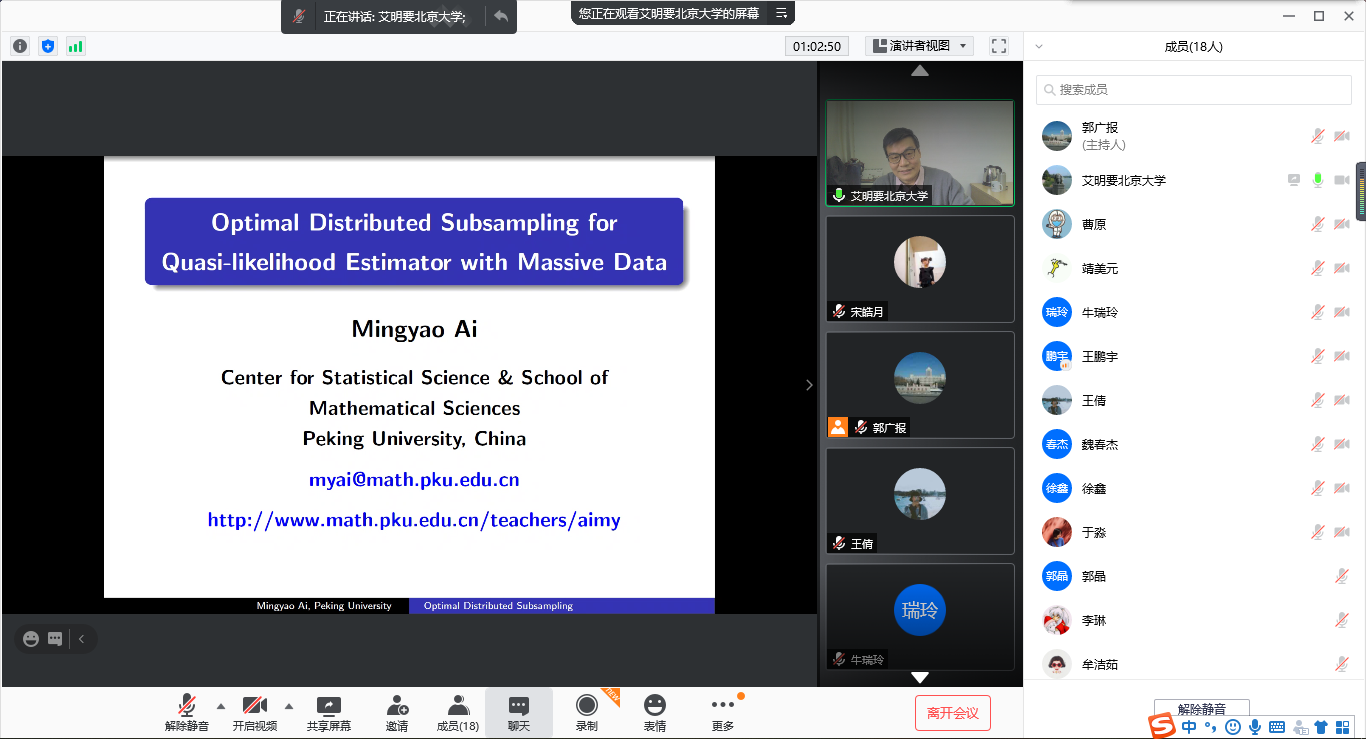 2020年12月10日下午,澳大利亚墨尔本大学钱国骐教授及北京大学艾明要教授应邀与bv伟德进行学术交流,在腾讯会议举行了两场主题为“统计与数据科学”的线上学术报告。报告由统计系副教授郭广报主持,统计系部分师生聆听了讲座,并与两位教授进行了交流。
