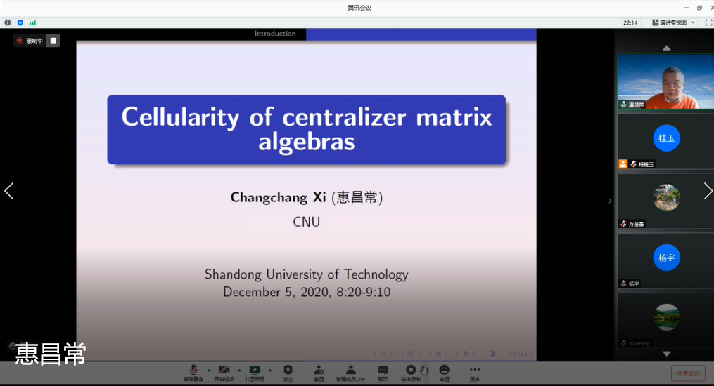 为了促进bv伟德代数学的发展,公司于12月5号举办了“代数与表示理论研讨会”。本次研讨会通过线上腾讯视频会议的形式进行,旨在介绍和了解代数和表示论及相关方向的一些最新进展,促进公司代数方向教师及研究生拓展视野、提升科研能力。