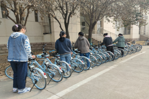 同学以美化校园为主题,以宿舍为单位,在校园内摆放自行车,经过同学们的共同努力,原本杂乱无章的自行车变得井然有序,在方便同学们存取车的同时,也增添了同学们心中的温暖;同时在校园里捡拾垃圾,弘扬环保精神,美化校园环境,创建美丽校园。