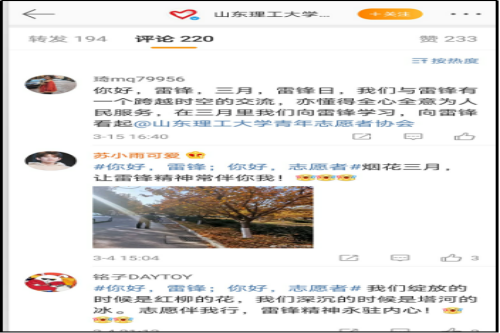 团总支号召广大团员青年主动拍下身边的“学雷锋”活动照片,参与微博互动,围绕“你好,雷锋;你好,志愿者”主题积极开展线上活动,形成线上线下联动,宣传学雷锋事迹,弘扬雷锋精神。