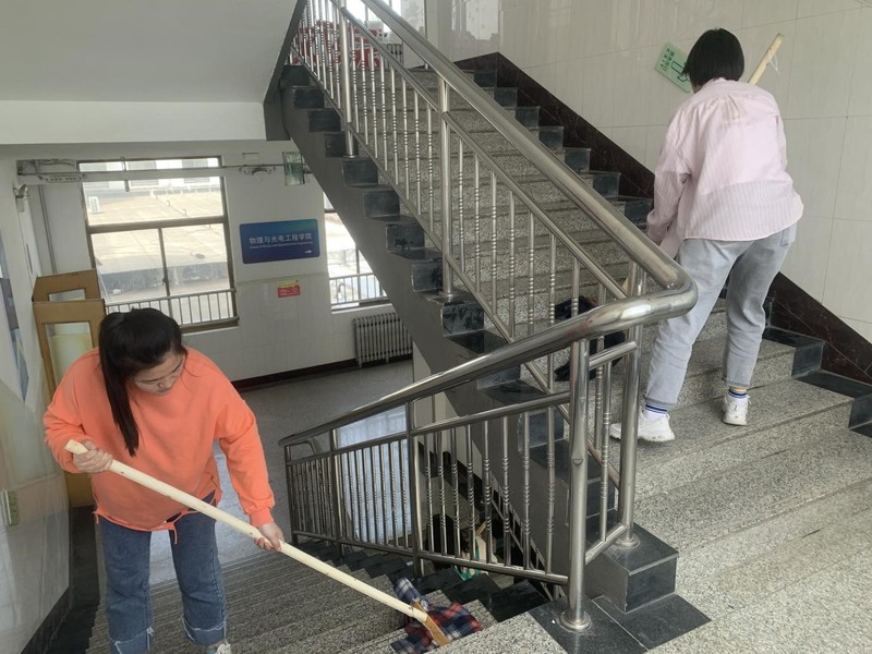 在活动负责人郭林杰和郭媛媛的带领下,各员工党员分工明确。全体党员分为三个小组,分别负责15号教学楼前自行车的摆放、各楼梯的卫生清洁以及各类展板、楼梯扶手的清洁工作。在活动进行的过程中,全体党员“撸起袖子加油干”,为营造清洁美丽的学习环境贡献自己的绵薄之力!