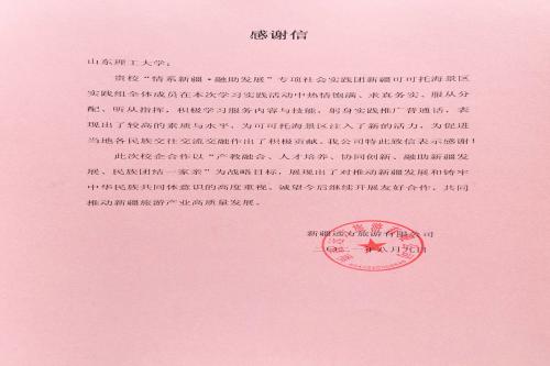 提升了综合素质。在总结座谈会上,实践团成员塔依尔江的发言代表了众多成员的心声:“公司提出的‘五有’人才培养目标,要的就是我们大家通过几年的学习锻炼深造,能够在报效国家、服务人民、奉献社会中建功立业。此次社会实践,正是检验、展现我们山理工“五有”老员工的机会,我们不负众望,努力做到了最好。提升了社会责任感与使命感,也提高了自身综合素养”。实践地可可托海景区对公司实践团工作给予了充分的肯定,并发来《感谢信》。