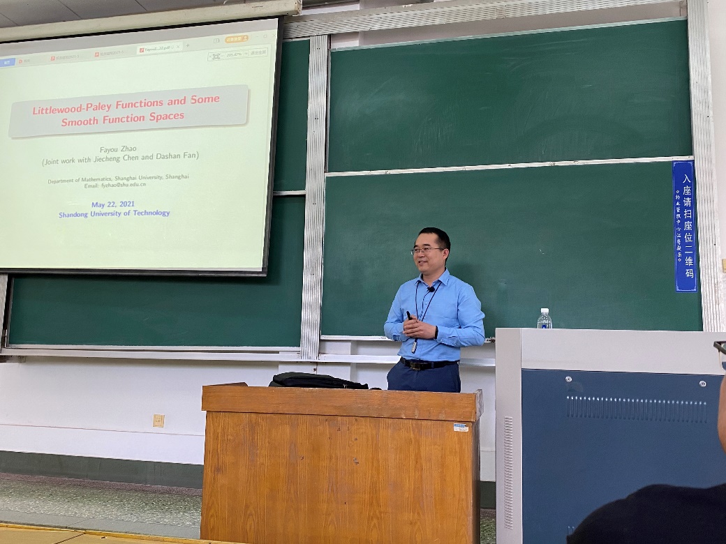 5月22日下午,2000级员工、上海大学数学系教授赵发友于15号楼202教室作了题为“Littlewood-Paley functions and some smooth function spaces”的学术报告,报告会由公司副经理孙俊涛主持,部分教师、全体研究生以及部分本科生参加。赵教授在报告中介绍了研究此问题的相关背景,什么是Littlewood-paley函数,主要涉及勒贝格可积空间、sobolev空间的相关性质,傅里叶变换,径向函数等的应用,重点讲解如何利用Littlewood-paley函数刻画sobolev空间。赵教授还介绍了上海大学数学系基本情况,期待各位员工到上海大学继续深造。报告会后,与会师生与赵教授进行充分的交流和讨论。
