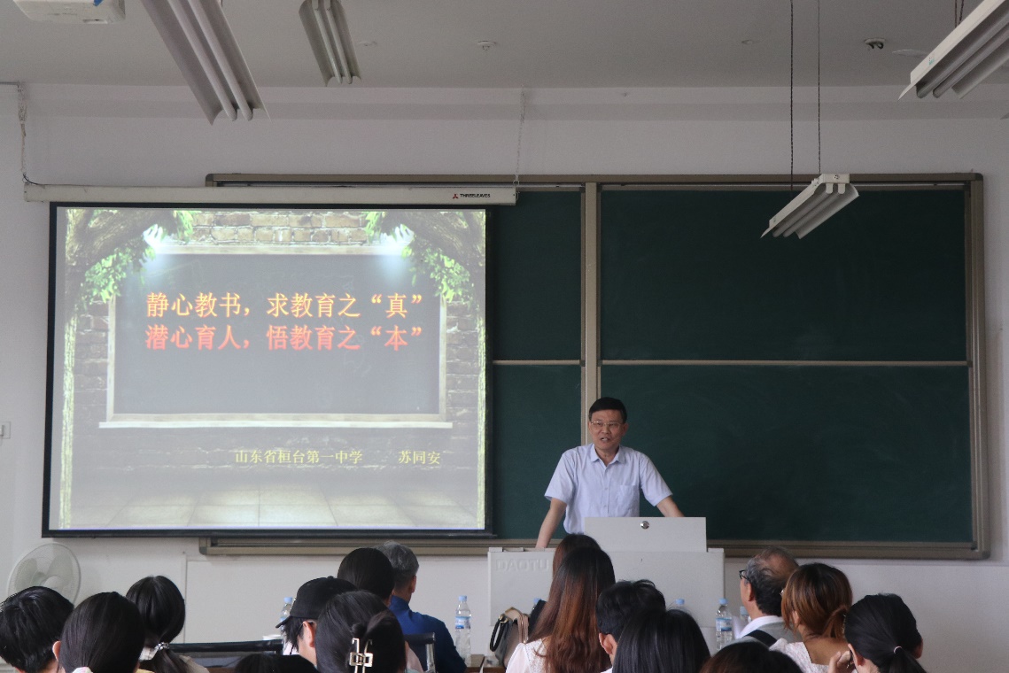 报告会第一阶段,2000级杰出员工,天津师范大学张新颜副教授带来了“关注数学本质,提升核心素养”主旨报告,以探究数学教育的两个转变为主线,提升了师范生对于数学本质认识,深化了对于数学核心素养的理解;1982级杰出员工,淄博市教研室朱恒杰教授做了“高考命题与数学思维的特点——高中数学‘面线点’瘦身复习法”为主题的报告,以高中数学“面线点”瘦身复习法为例子说明如何利用数学思维的特点提升员工的复习效率,启发师范生将来可从命题者的角度结合数学思维的特点进行教学;1982级杰出员工,桓台一中苏同安教授作了“静心教书,求教学之真,潜心育人,悟教育之本”的主旨报告,苏同安认为,教师应做一个达到“四有”标准的好老师,用辩证思维多角度研究数学教学的方法,让同学们深深地体会到数学的哲学、数学的魅力与数学的美学。数学系主任孙文华老师主持了本段报告。