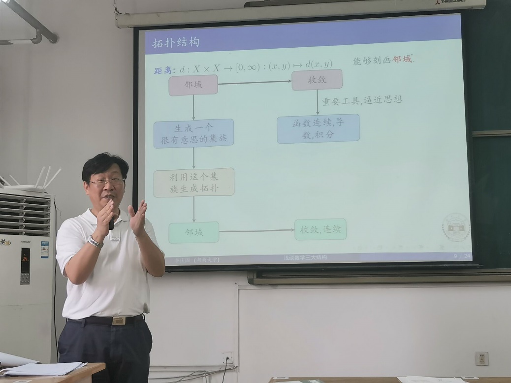 5月26日上午,79级员工、湖南大学李庆国教授在15号教学楼505作题为“现代数学的三大基础结构”学术报告,报告由公司经理李功胜主持,万哲先实验班同学参加了此次报告会。会议伊始,公司经理李功胜教授首先热烈欢迎并诚挚感谢李庆国教授到公司进行学术交流。李庆国教授以数学结构背景展开,主要围绕拓扑结构、拓扑学与其他领域的应用展开报告,报告结束后李庆国教授与在场的同学们展开交流。本次报告会多角度展现了李庆国教授在数学结构的独特见解,开阔了同学们的专业视野,引发了同学们对于数学结构的深刻思考。