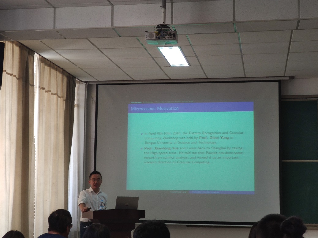 5月26日上午,2003级优秀员工、长沙理工大学副教授郎广作了题为《基于三支决策理论的冲突分析研究》的学术报告,报告由公司副经理孙俊涛教授主持,公司部分教师及全体研究生参加。郎广教授以冲突分析研究切入主题,介绍了三支决策理论的背景、框架与应用。郎教授以生活中的交通信号灯为例,形象为广大师生介绍了三支决策理论。最后郎教授为广大师生介绍了该理论的实际应用。通过报告,师生们对冲突分析研究及三支决策理论有了初步了解与认识,开阔了员工的学术视野。