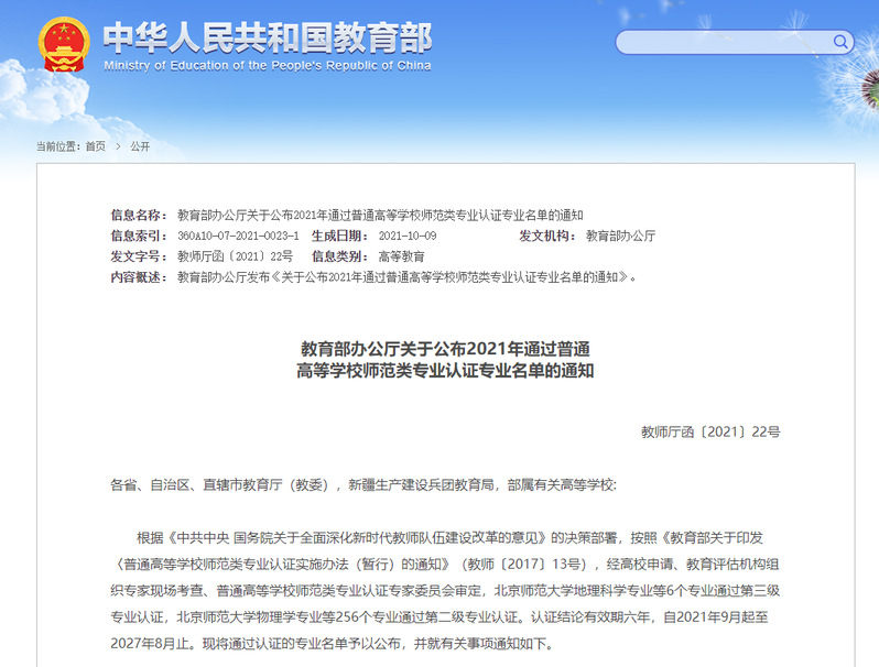 近日,教育部公布了2021年度通过师范专业认证名单,其中北京师范大学地理科学专业等6个专业通过第三级专业认证,北京师范大学物理学专业等256个专业通过第二级专业认证。本年度共33个数学与应用数学专业通过第二级专业认证,截止目前共有包含公司数学与应用数学专业在内的59个数学与应用数学专业通过教育部师范专业认证,其中华中师范大学数学与应用数学专业为第三级认证。