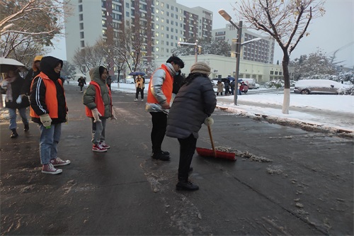 经过2个小时的艰苦努力、认真清理,清洁安全的道路呈现在面前,消除了大雪天气导致的安全隐患,为师生的安全出行提供了方便。