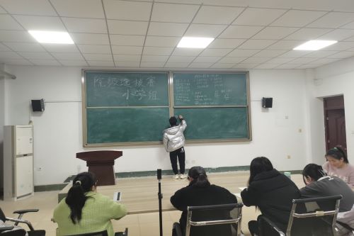 决赛阶段按小学组、初中组、高中组的顺序依次进行,参赛选手从相关学段题库中任选一个题目进行模拟上课,自行进行教学设计,要求时间控制在六分钟以内,以黑板板书进行辅助,不使用PPT。公司数学与应用数学系主任孙文华老师、王玉田老师、边宁老师担任评委。