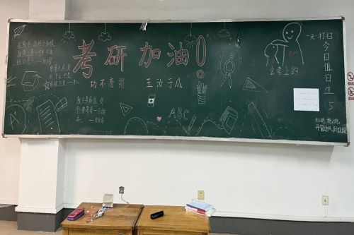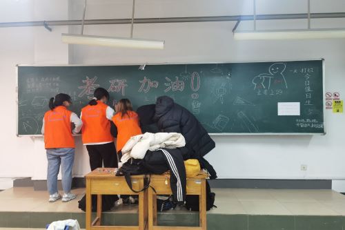 第二阶段,志愿服务队成员在干净的自习室里制作了简单的考研助力黑板报,并写上了自己对考研学子的祝福语、考研注意事项以及倒计时,以便考研学子以轻松愉悦的心情备考,合理把握时间。