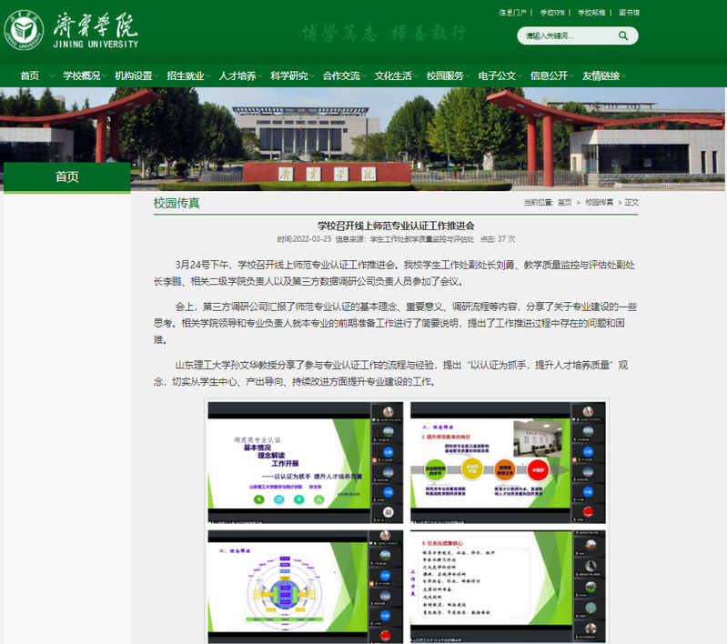 3月24号下午,公司数学与应用数学专业负责人孙文华老师应济宁公司邀请参加专业认证会议并做线上报告,济宁公司员工工作处副处长刘勇、教学质量监控与评估处副处长李鹏、数学、外语、中文等相关二级公司负责人等参加了会议。