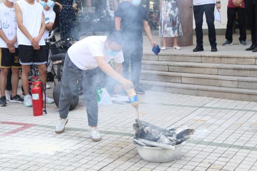 演练共分为三个环节:一是演练员工实验课期间突发火情应急处置场景,二是现场进行灭火器的操作演示,三是常见生活用品灭火常识教育及演示。