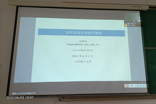 开班仪式结束之后,王建锋副经理主持了冯荣权教授为实验班同学作了题为“如何保证信息传输的可靠性”精彩的学术科普报告,介绍了数字通信可靠性的需求,和基于此建立的纠错码理论,及其在信息保密性方面的应用,并就相关问题和同学们进行了热烈的讨论。