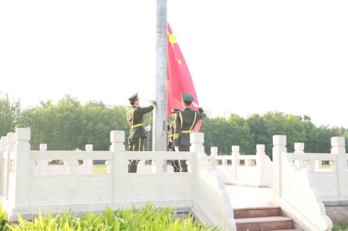 升旗伊始,英姿飒爽的国旗护卫队队员们护送五星红旗进场,在全体师生的注目礼下,伴随着庄严的中华人民共和国国歌,五星红旗冉冉升起。