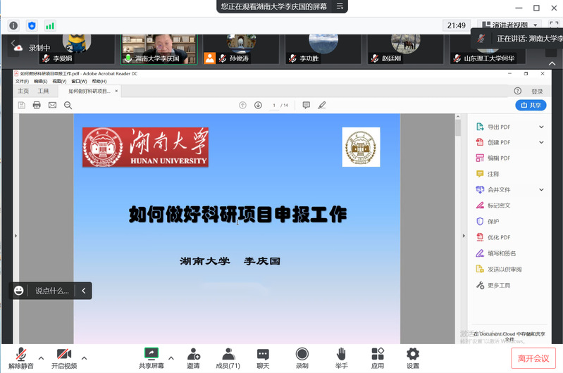 报告中,李庆国从确定选题、提炼摘要、如何写Introduction、研究内容、拟解决的关键问题、解决方案、研究基础和研究进度等八个方面进行了详细的分析和说明,针对广大青年教师在基金撰写过程中遇到的共性问题,借助实际案例进行了生动的分析和讲解。同时他结合自身多年来申请和评审科研项目的经验体会,强调了科研项目申请书的撰写技巧。报告结束后,与会教师针对国家基金申报相关问题与李庆国进行了交流和讨论。