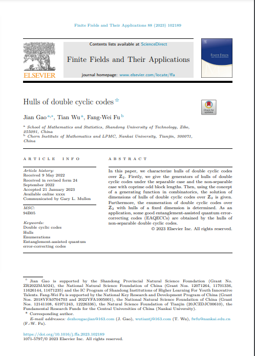 近日,公司代数编码团队在国际知名数学期刊《Finite Fields and Their Applications》发表题为“Hulls of double cyclic codes”的研究论文。公司代数编码青年团队负责人高健副教授为论文第一作者兼通讯作者,2020级硕士研究生吴甜、南开大学陈省身数学研究所符方伟教授分别为论文第二作者和第三作者。