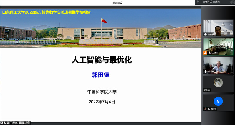开班仪式结束后,大家一起聆听了中国科公司大学讲席教授、二级教授、中国科公司大学数学科学公司郭田德副经理的《人工智能与最优化》科普报告,中国科公司大学教授、中国科公司数学与系统科学研究院二级研究员、国家数学与交叉科学中心闫桂英副主任的《组合数学的简洁、美丽与困难》科普报告。