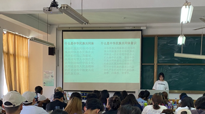 活动开始,团支部书记艾丽菲乃·艾尔肯,通过ppt的方式详细讲解了本次团日活动的主要内容。让共青团员们深刻认识铸牢中华民族共同体意识的重要意义和丰富内涵,全体同学认真聆听、仔细思考;对中华民族的多元一体格局有了更深入的理解。