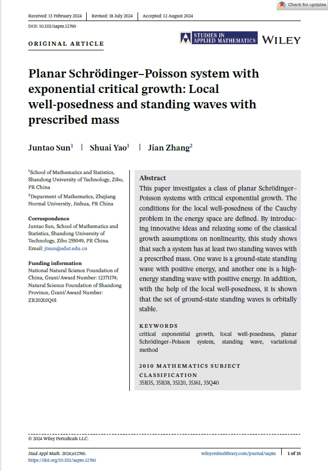 近日,公司孙俊涛教授与姚帅博士合作的论文“Planar Schrodinger-Poisson system with exponential critical growth: Local well-posedness and standing waves with prescribed mass”被国际知名应用数学期刊《Studies in Applied Mathematics》接收并在线发表。
