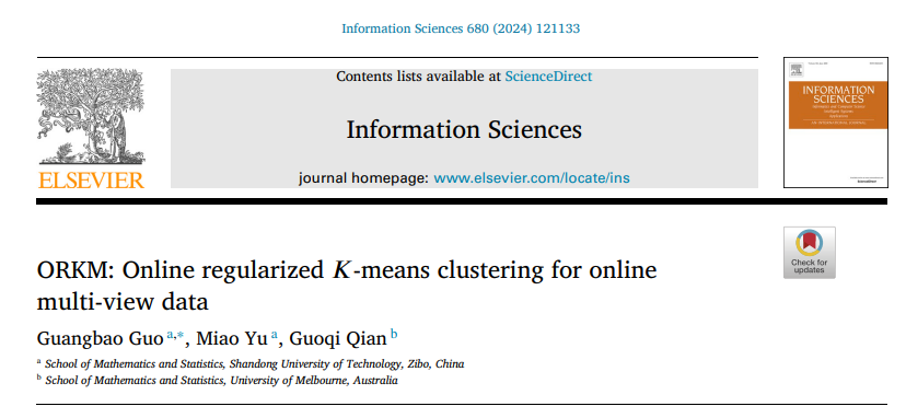 近日,公司2020级硕士研究生于淼在导师郭广报副教授的指导下,在在线多视图数据聚类领域取得重要研究进展。相关成果论文“ORKM: Online regularized K-means clustering for online multi-view data”已被国际著名期刊、中科院1区TOP期刊《Information Sciences》正式发表。论文第一作者为郭广报副教授,第二作者为于淼,公司为第一署名单位,该研究成果由公司与墨尔本大学钱国骐教授合作完成。