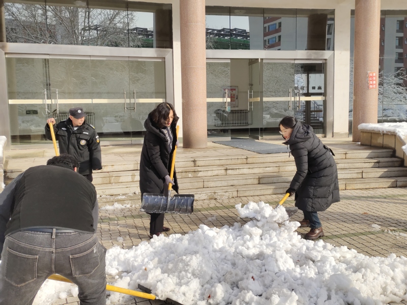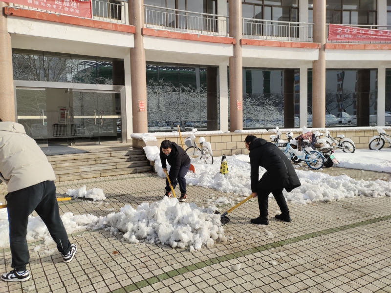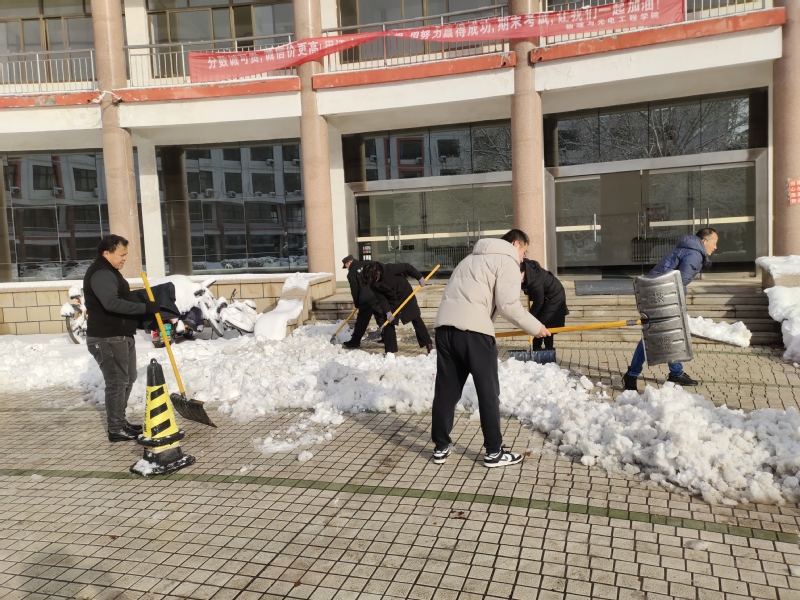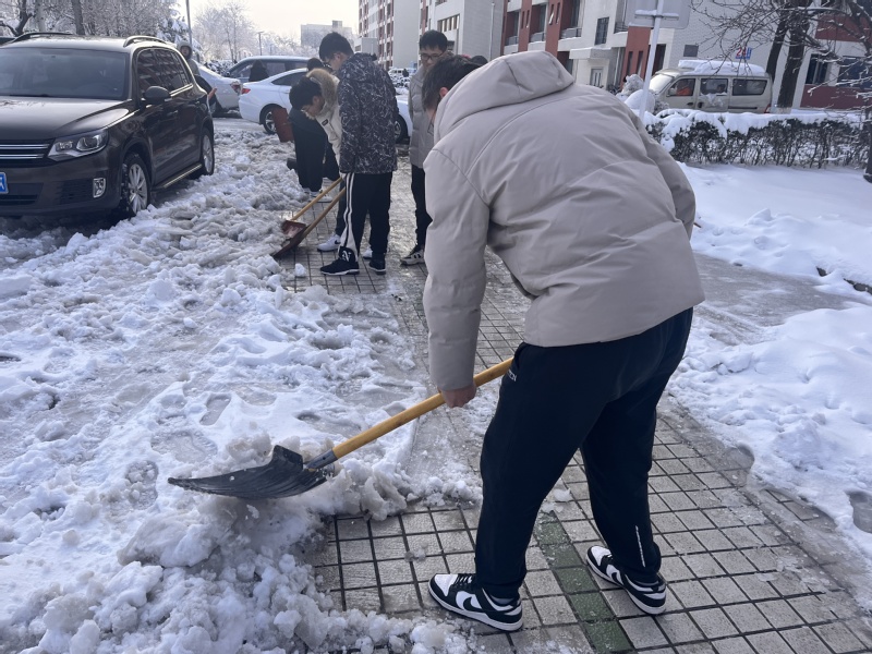 在凛冽寒风中,教师与员工分工合作,手持铁锹破开雪层,扬起雪铲清理积雪,以劳动的热情驱散了冬日的严寒。教师们以身示范,将扫雪现场转化为生动的劳动教育课堂;员工党员和员工骨干们干劲十足,或三五协作搬运积雪,或细致清扫台阶残冰,青春的朝气与团结的力量在一次次挥洒汗水的行动中彰显。数小时后,将教学楼前及周边道路积雪清扫完毕,主要通道恢复通畅。