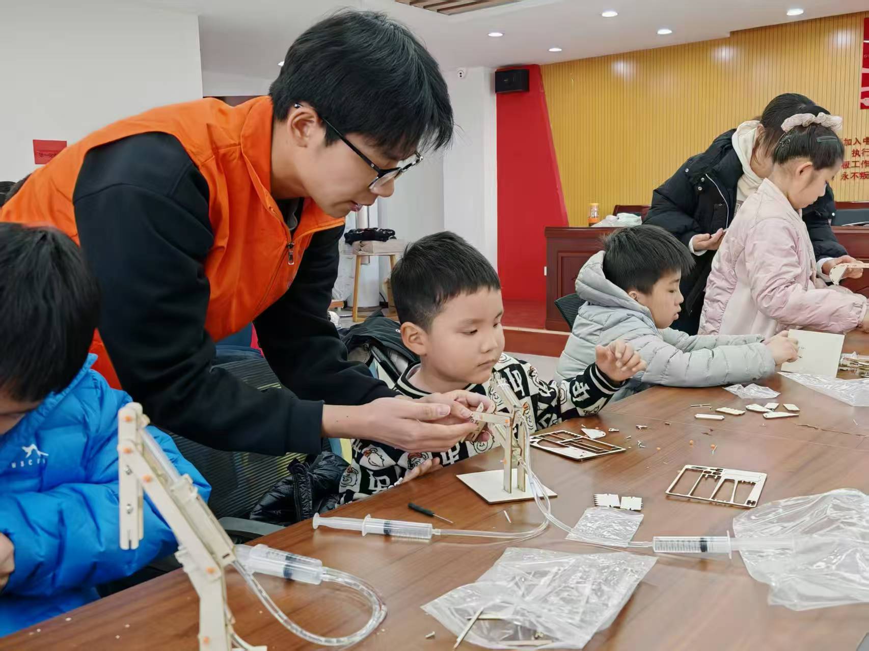 活动伊始,志愿者和科技馆工作人员简单对社区服务中心进行了基础的环境整理,为后续活动开展营造良好氛围。之后,便全身心投入到此次活动的核心 —— 为社区孩子们带来的液压挖掘机拼装科普课程中。