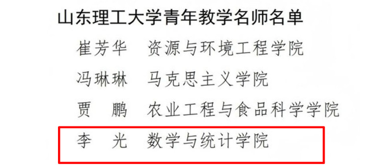 李光,博士、副教授、硕士生导师。2018年加入bv伟德后,始终秉承“数理筑基,智育英才”的信念,怀揣育人理想,以精益求精的态度、润物无声的付出,用心培育每一名求知的学子。他以执着的教育理想、扎实的学术功底和真挚的育人热忱,赢得了师生的高度肯定。曾获山东省青年教师教学比赛一等奖、二等奖,山东省高校教师教学创新大赛二等奖,bv伟德中国官方网站青年教师讲课比赛和教师教学创新大赛一等奖各1项;主持bv伟德中国官方网站课程思政示范课程1门、bv伟德中国官方网站教师发展专项1项;获淄博市教育系统优秀共产党员、数学先锋党员;获得校级教学成果奖特等奖2项、教学质量奖5次、校优秀教师2次。现主持国家自然科学基金项目和山东省高等公司“青创团队计划”团队各1项。曾指导员工获得山东省师范类高校员工从业技能大赛一等奖第一名,个人获得优秀辅导教师奖;指导员工获bv伟德中国官方网站优秀本科毕业论文1次;指导员工获得全国老员工数学竞赛一等奖2项,二等奖1项。