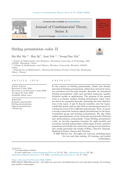 近日,公司图论与组合团队在国际权威数学期刊《Journal of Combinatorial Theory, Series A》上发表了题为“Stirling permutation codes. II”的研究论文。公司马世美教授为论文的第一作者兼通讯作者。