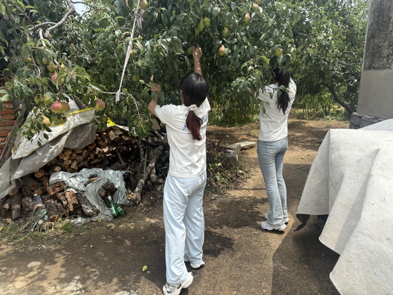 当日上午,实践团10名成员按计划前往龙口市七甲村果园参与助农采摘。在当地农户的指导和示范下,团队分为三组开展劳作:第一组前往指定区域,学习采摘技巧,挑选成熟且品相完好的桃梨;第二组与农户一起进行分拣和装箱,根据品质对果实进行分级处理;第三组负责水果的集中转运,协助农户将包装好的水果运往村内集散点。通过明确的分工和团队协作,成员们逐渐熟悉流程,半天内完成近一亩果园的采摘任务。