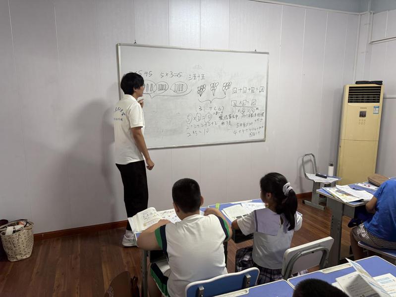 上午,实践团成员们走进当地孩子们中间。经过对当地儿童学习情况的调研,实践团成员根据不同班级的教学进度采取多样的方式进行教学。讲台前,志愿者用生动的例子拆解知识难点;课桌旁,则蹲下身来,一对一解答作业本上的困惑。