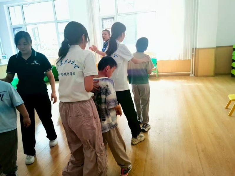 随后,实践团组织了“传递爱心”团体合作游戏,成员们与孩子们手牵手围成圆圈,将象征爱心的小物件依次传递。伴随音乐的节奏,孩子们在轻松氛围中逐渐放松,积极参与。实践团成员们的鼓励与陪伴,让孩子们感受到温暖与信任。该环节不仅增强了孩子们的团队协作能力,也有效提升了他们的社交与情感表达能力,成为活动中最温馨的一幕。
