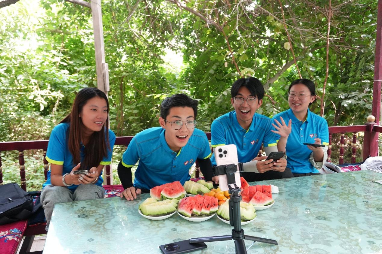 成员们走进当地农家乐展开助农直播,直播中,团队不仅详细讲解产品的生长环境、品质优势,更穿插介绍了麦盖提的风土人情,让更多人通过语言了解这片土地的魅力,以语言为媒介为农产品销售拓宽路径,让普通话成为助力乡村振兴的“致富桥”。